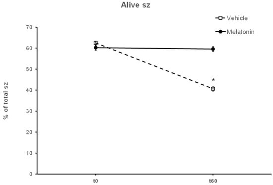 The effect of melatonin on the viability of spermatozoa (sz). Frozen–thawed spermatozoa were incubated at 37 °C for 60 min in the presence of DMSO (Vehicle) or 100 μM melatonin (Melatonin). The percentage of live spermatozoa was determined by optical microscopy after staining of spermatozoa with trypan blue solution. The results are presented as mean values (% of total spermatozoa) ± SEM (n = 6). The asterisk (*) indicates statistically significant different values (p ≤ 0.01).