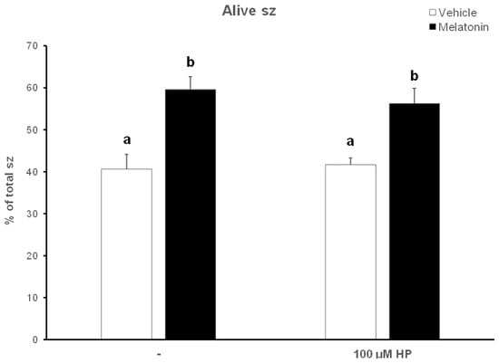 The effect of melatonin on the viability of spermatozoa (sz) after exposure to 100 μΜ H2O2. Cells were incubated at 37 °C in the presence of DMSO (vehicle, white bars) or 100 μΜ melatonin (black bars) for 60 min, at which point the indicated samples were exposed to hydrogen peroxide (HP), washed and stained with trypan blue solution. Spermatozoa were evaluated as alive (unstained) or dead (stained) by observation on an optical microscope. Results are presented as mean values ± SEM (n = 6). Different letters indicate statistically significant differences (p < 0.01).