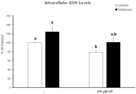 The effect of melatonin on intracellular GSH levels after exposure to 100 μΜ H2O2. Frozen–thawed bovine spermatozoa were incubated in the presence of DMSO (vehicle, white bars) or 100 μΜ melatonin (black bars) for 60 min, at which point the indicated samples were exposed to hydrogen peroxide (HP). Spermatozoa were lysed and GSH levels in the lysates were determined spectrophotometrically. Results are presented as mean values ± SEM (n = 6) and the different letters indicate statistically significant differences (p < 0.05).
