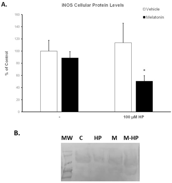 (A). Protein levels of iNOS in bovine spermatozoa incubated for 60 min with DMSO (vehicle, white bars) or 100 μΜ melatonin (black bars) and exposed to 100 μΜ H2O2 (HP), as determined by Western blot analysis. Results are expressed as percentage of the Control-t60. Each bar represents mean values ± SEM (n = 4). The asterisk (*) indicates statistically significant differences from the Control-t60 group (p < 0.05). (B). Representative membrane after blotting with the anti-iNOS antibody (see also Figure S1). MW: molecular weight markers, C: Control-t60, HP: 100 μM H2O2, M: Melatonin-t60, M-HP: Melatonin-HP.