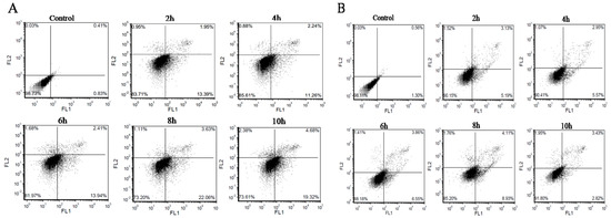 A Dead Cell Apoptosis Kit with Alexa Fluor®488 annexin V and PI for Flow Cytometry (Invitrogen, Thermo Fisher Scientific, Waltham, MA, USA) was used to detect apoptosis in BMECs. Briefly, cells were seeded for 24 h at 37 °C and 5% CO2 in a 60 mm culture dish. After infection, the cells were separated, centrifuged for 5 min at 1000 rpm, and rinsed twice with ice-cold PBS. The cells were then resuspended in the binding buffer at a concentration of 1 × 106 cells/mL, and 100 µL of the cell suspension was stained with 5 µL of Annexin V-FITC and 5 µL of PI for 15 min at room temperature in the dark. Apoptosis was analyzed using a Sysmex CyFlow Cube8 (PartecGmbh, Goerlitz, Sachsen, Germany).