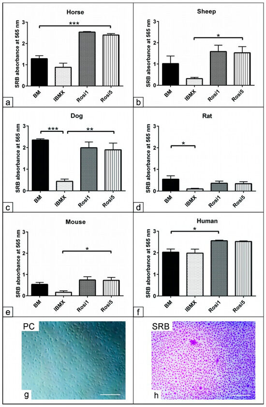 Assessment of cell protein contents indicative of cell number after adipogenic induction. (a–h) Semi-quantitative measurement of total protein content using SRB assay represents the cell numbers after day 14 in the presence of IBMX, 1 µM rosiglitazone (Rosi 1), and 5 µM rosiglitazone adipogenic medium. Non-induced cells in basal medium (BM) served as negative controls. Evaluation of the total protein content reveals increases in cell numbers in the presence of Rosi 1 and Rosi 5 compared with IBMX and BM in horse- (a), sheep- (b), mouse- (e), and human- (f) derived cells. Note the marked reduction in the cell numbers in the IBMX condition for all species except for human cells. Semi-quantitative analysis of total protein content using sulforhodamine B (SRB). (g) Phase contrast for ASCs of dog in growth medium at 14 days. (h) The cells were fixed with 4% paraformaldehyde for 20 min, and then were stained with 0.4% SRB solution (Violet) in 1% acetic acid for 10 min. All data are presented as the mean ± SEM. * = p < 0.05, ** = p < 0.01, *** = p < 0.001. Scale bar = 100 µM.
