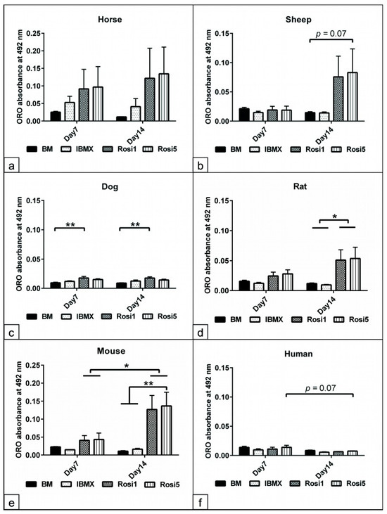 Evaluation of the fat content following adipogenic induction. (a–f) Semi-quantitative measurements of fat formation within adipocytes at day 7 and day 14 of adipogenic induction in the presence of IBMX, 1 µM rosiglitazone (Rosi 1), and 5 µM rosiglitazone adipogenic medium. Non-induced cells in basal medium (BM) served as negative controls. Oil Red O (ORO) stained cells were incubated with isopropanol for 30 min at RT with mild shaking in order to dissolve all bound stains. The acquired solution was loaded in 96-well plates (n = 4 per experimental group). The absorbance was measured in triplicate at 492 nm. Semi-quantitative analysis of the fat content in horses (a), sheep (b), dogs (c), rats (d), mice (e), and humans (f). Marked increases in cell adipogenesis up to day 14 when Rosi 1 and Rosi 5 were supplemented compared with IBMX and BM conditions. All data are presented as the mean ± SEM. * = p < 0.05, ** = p < 0.01.