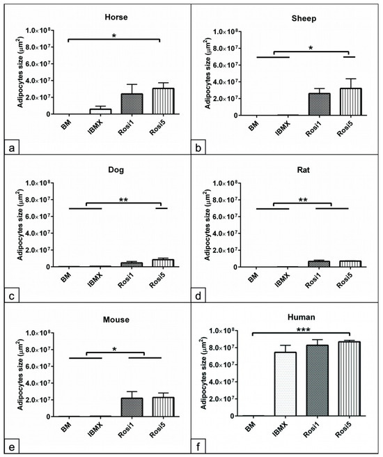 Having demonstrated that various differentiation protocols relatively affect the cell protein and fat contents of the adipogenic committed cells, as a next step using morphometric parameters, it was analyzed whether various adipogenic inducers altered the size of the adipocytes. Morphometric analyses at day 14 revealed a significant increase in the size of adipocytes in the Rosi 5-induced cells from horses (p < 0.05), sheep (p < 0.05), and dogs (p < 0.01) compared to BM or IBMX cultivated cells (Figure 4a–c). Data analysis showed that both Rosi 1 and Rosi 5 significantly increased the adipocyte size in the rat- (p < 0.01) and mouse (p < 0.05)-induced cells compared with the corresponding cells in IBMX and BM (Figure 4d,e). The results from human cells showed a significant increase in adipocyte size (p < 0.001) for IBMX, as well as Rosi1 and Rosi 5 compared to the non-induced cells in BM (Figure 4f). In summary, these data show that selection and optimization of the differentiation protocol can improve the capacity of ASCs and that the differentiation potential varies greatly between species under similar induction conditions.