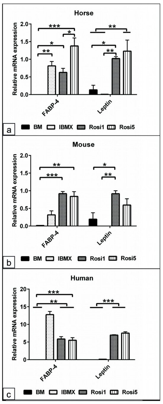 Quantification of the relevant adipogenic differentiation marker expression. (a–c) Quantitative RT-PCR of cells lysates from horse (a), mouse (b), and human (c) cells following 14 days of adipogenic induction in IBMX, 1 µM rosiglitazone (Rosi 1), and 5 µM rosiglitazone medium. For all experimental groups, 1 µg of the harvested RNA (n = 4) was reverse transcribed. By using the relevant primers, the adipogenic markers, fatty acid binding proteins-4 (FABP-4), and Leptin expression were measured. The data analysis reveals the upregulation of FABP-4 expression in the Rosi 1-, Rosi 5-, and IBMX-based conditions compared with BM in all species. Note the marked inhibition of Leptin expression with IBMX condition in horse-, mouse-, and human-induced cells. All data are presented as the mean ± SEM. * = p < 0.05, ** = p < 0.01, *** = p < 0.001.
