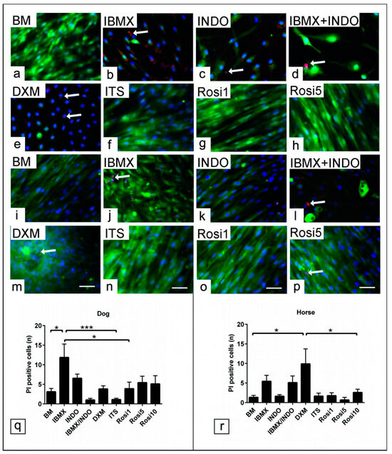 PI staining showed a marked increase in apoptotic/necrotic cells in the presence of IBMX, INDO, and DXM in dog and horse cells (Figure 7a–p). The number of PI-positive cells in five random microscopic fields per experimental condition (n = 3) was counted. Analysis revealed that the number of PI-positive cells was increased in the presence of IBMX (p < 0.05, p < 0.001, and p < 0.05, respectively) compared with cells in BM, ITS, and Rosi 1 in dogs (Figure 7q). Similarly, PI-positive cells increased in the presence of DXM, IBMX, and INDO (p < 0.05) compared to cells in BM, ITS, and Rosi medium for horse cells (Figure 7r). Taken together, the data clearly demonstrate that proper selection of adipogenic components not only can influence the cell proliferation and differentiation ability but also may preserve the cell population from apoptosis.