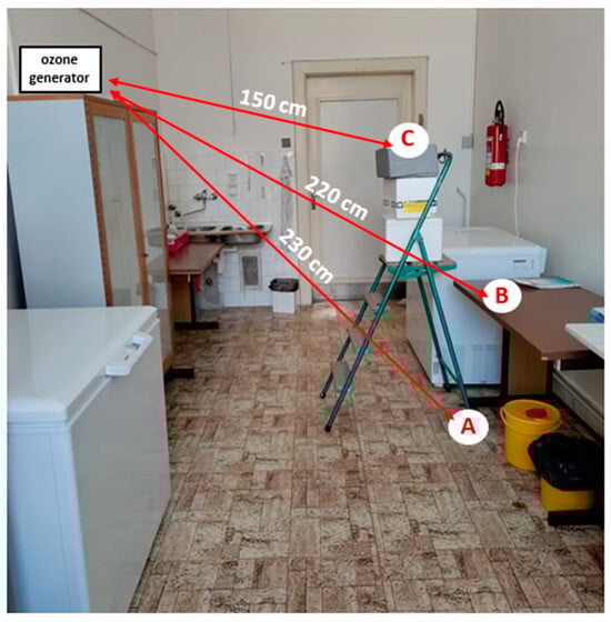 3 (2.86 m (width) × 6.70 m (length) × 3.67 m (height)) at the Department of Infectious Diseases and Microbiology, University of Veterinary Sciences Brno. The average temperature and humidity in the room during individual measurements were 25.5 °C and 55.25%, respectively. At the time of the experiment, the room was only equipped with basic work-related appliances (e.g., table, chairs, wardrobe, switched-off freezer units, storage boxes). Petri dishes containing samples of pathogens were placed in the room at 3 selected sites representing 3 different heights (A: floor level; B: desk (height 77.5 cm); C: ladder with box (height 152 cm)) to verify the impact of sample location on the effectiveness of ozone application. Two different devices (hereafter referred to as A’ and B’) were used to produce the gaseous ozone in order to verify the impact of performance on the viability of the pathogens. Only one of the devices was in operation at any given time during the experiment. The technical specifications relating to the devices used are given in