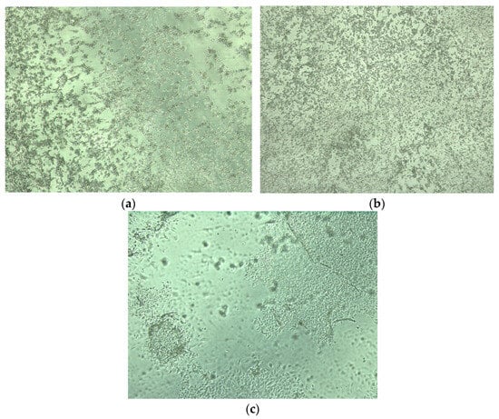 Figure 3c). We assume that the destruction of cells was probably caused by the residual ozone; i.e., its free radicals (hydrogen peroxide and hydroxyl), which emerged as part of the decay of ozone in the liquid (in the DMEM medium, which was used to sustain CRFK cells). Another explanation for the destruction could be the presence and effect of nitrogen compounds on cells in the liquid medium. Generators that produce ozone from the air additionally create intermediate byproducts of air ionization—diatomic molecules O