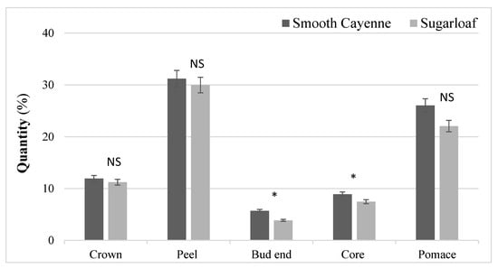 The amount of the two varieties of pineapple by-products obtained by processing the whole fruit. NS: non-significant between by-products, *: p < 0.05.