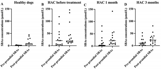Scatterplots of pre- and post-prandial serum total bile acids (SBAs) concentrations in healthy dogs (A), dogs with HAC before treatment (B), and dogs with HAC after treatment for 1 month (C) and 3 months (D). Lines represent medians.