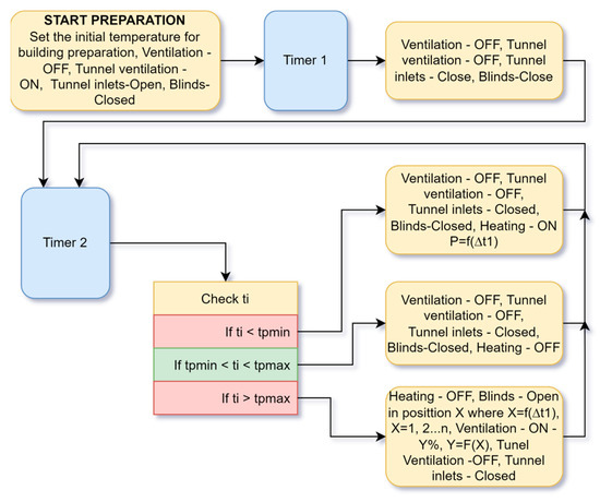 Figure 1 shows an algorithm for preparing the building before introducing the chickens. This mode should be started at least 24 or 48 h before the chickens are housed. A minimum and maximum maintenance temperature must be set at start-up. The system starts by ventilating the room to provide fresh air and remove smells from the preparatory disinfection.