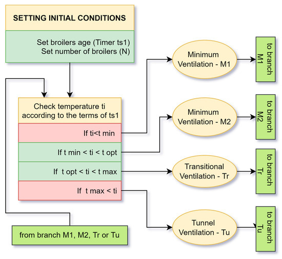 The main working algorithm of the proposed cyber-physical system can be divided into five parts for easier presentation. In the first part (Figure 2), the temperature in the building at the level of the broilers ti is measured and compared with the temperature set by the system. That temperature changes according to the age of the chickens by the timer ts1. It depends on what type of ventilation will be undertaken. The system goes through one cycle of operation, then goes through the ti check again. This is repeated continuously, with one exception in the tunnel ventilation Tu.