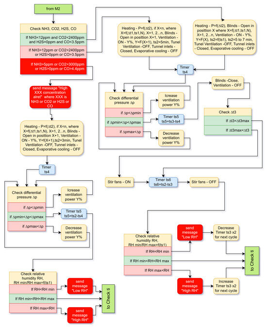 In the minimum ventilation mode M2, the system first checks for the presence of harmful gases. If a high concentration is not detected, it proceeds to the following actions. The tunnel inlets are closed and the tunnel fans are turned off. Evaporative cooling is also turned off. The heating is switched on, and the power or the number of switched-on heating devices depends on the difference between the optimal temperature tiopt for the current age of the broilers and the measured ti. The blinds are opened in position X, which is determined by the difference between the internal and external temperature ∆t1, and by the age ts1 and the number N of chickens. Age and number determine the live weight of the chickens, which determines what volume of fresh air should be provided.