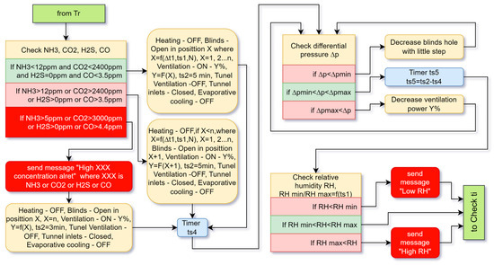In transitional ventilation (Figure 4), the system again first checks for harmful gases. If they are normal, the following actions are applied. Heating, tunnel ventilation and evaporative cooling are switched off, and tunnel ventilation inlets are closed. The blinds are opened in position X and the ventilation is switched on at the corresponding power Y, as in minimum ventilation. The duration of the ts5 cycle is 5 min. Ventilation continues throughout the whole cycle. After the blinds’ positioning time has expired, the differential pressure ∆p is checked, and at the end of the cycle, the relative humidity RH is checked. If the RH is not within the norms, the system sends one-time messages with the measured value, but it does not take any action to regulate it. In this case, supporting the temperature has a higher priority. The cool air entering from the transitional ventilation provides constant movement of the air inside the building. Therefore, it is not necessary to turn on the circulation fans. After the RH check, the algorithm returns to the beginning to measure the temperature ti.