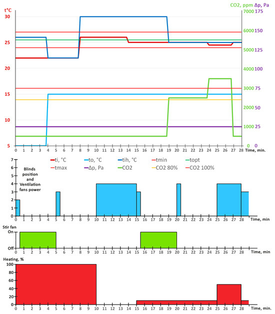 At the 25th minute, the system measured temperature ti and the level of carbon dioxide CO2 above the permissible norm, so it entered emergency mode for 3 min. It sent a message “Warning: High CO2 level—3000 ppm”. The blind opened to position 4, the ventilation fan turned on at the appropriate power and the heater increased its power to 50%.