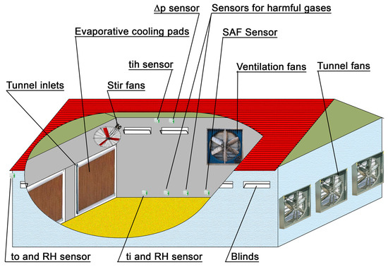 For the system to work correctly, the sensors for indoor temperature ti, indoor relative humidity RH, speed of air flow SAF, ammonia NH3, carbon dioxide CO2, carbon monoxide CO, hydrogen sulfide H2S and fine dust particles must be at the level of the chickens. Exceptions are the sensors for measuring the temperature below the roof of the building tih, as well as those for outdoor temperature to, outdoor relative humidity RHout and differential pressure ∆p.
