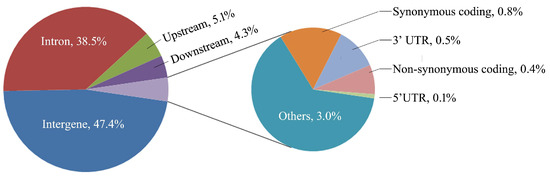 The basic information on the distribution of SNPs that were detected in this experiment on the genome is shown in Figure 1. Among them, there were 4292 SNPs located in the gene 5′-UTR and 3′-UTR; 293,091 SNPs were located in introns; a total of 8725 SNPs were located in the gene coding region.