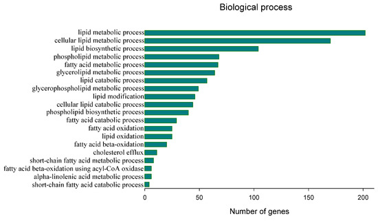 Genes harboring SNP sites were annotated, and we focused on selecting 6019 SNPs which were located in genes with clear annotations and had the potential to induce changes in the encoded proteins. These selected SNPs included polymorphic loci in 5′- and 3′-UTRs, the loss and acquisition of start or stop codons, mutations in splice donor or acceptor sites, as well as SNPs causing synonymous and missense mutations in AAs. Collectively, these SNPs came from a total of 2526 functional genes. A GO analysis of these genes showed that a total of 224 genes were involved in biological processes (BPs) related to lipid metabolism, with 217 genes participating in the top 20 BPs related to lipid metabolism, mainly including the biosynthesis of lipids, the oxidation of FAs, and metabolism related to glycolipids, phospholipids, and cholesterol (Figure 2).
