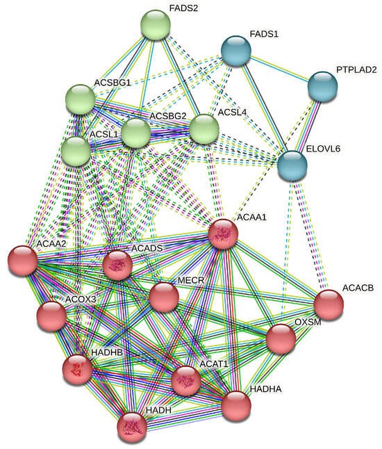 In total, 19 functional genes were involved in these three significantly enriched KEGG pathways, and the SNPs detected on them mainly caused missense mutations (Table 3) or were located in the 3′ UTR. These genes can be further studied as candidate genes that affect fat-related meat quality traits in meat-type pigeons. Their protein–protein interactions (PPIs) were analyzed using STRING (Figure 3), and the network clusters of PPIs are shown in Table 4. Most of the clusters were associated with FA metabolism, and two were involved in the degradation of BCAAs (Val, Leu, and Ile).
