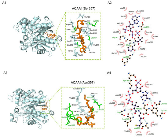 As shown in Figure 4A, ACAA1(Ser357) and ACAA1(Asn357) had common hydrophobic interaction sites, which included Asp40, Leu251, Leu252, Leu266, Val268, and Leu269. They also shared Gly9, Ala253, and Lys360 as the residues involved in the formation of hydrogen bonds with the ligand. The missense mutation of the 357th AA on the protein resulted in alterations in the interactive residues, as well as the type of interactions between the ligand and the active site of the protein. In ACAA1(Ser357), Gly267 formed a hydrogen bond with the ligand, while in ACAA1(Asn357), Gly267 interacted with the protein through hydrophobic interactions. In ACAA1(Asn357), Tyr386, Gly388, and Asn389 formed extra hydrogen bonds with the ligand. The affinity scores of ACAA1(Ser357) and ACAA1(Asn357) to the ligand were −7.9 kcal/mol and −5.8 kcal/mol, respectively.