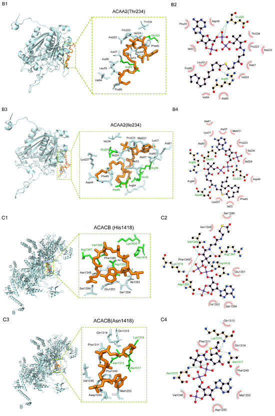 Similarly, in ACAA2(Thr234) and ACAA2(Ile234) (Figure 4B), Arg56 and Glu225 formed hydrogen bonds with the ligand. Phe45, Ile53, Ala57, Ala60, Pro223, and Ile224 were involved in the hydrophobic interactions with the ligand. The interactions between Asp49 and the ligand were hydrophobic interactions in ACAA2(Thr234) and a hydrogen bond in ACAA2(Ile234). The binding affinity scores of ACAA2(Thr234) and ACAA2(Ile234) to the ligand were −5.9 kcal/mol and −5.3 kcal/mol, respectively. In ACACB (Figure 4C), the switch of basic His to acidic Asn impacted the conformation around the mutated residue. As a result, there were five hydrogen bonds in ACACB(His1418) and only three in ACACB(Asn1418). The affinity scores of ACACB(His1418) and ACACB(Asn1418) to the ligand were −5.3 kcal/mol and −5.1 kcal/mol, respectively. Our results showed that these non-synonymous AA mutations in ACAA1, ACAA2, and ACACB could lead to changes in the non-covalent interactions between the protein receptor and its ligand. These changes were likely to impact the binding and catalysis of the protein towards substrates, thereby affecting the enzymatic activities.
