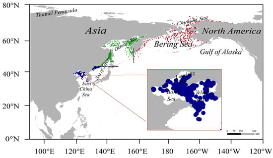 This study focused on the distribution range of spotted seals in the North Pacific, with the main study area located in the temperate and cold temperate coastal and littoral regions (90° E—240° W, 0° N—80° N; Figure 1). The spotted seal occurrence data were collected from the literature, the Global Biodiversity Information Facility (GBIF; http://www.gbif.org/, accessed on 21 December 2022) [24], and the Ocean Biogeographic Information System (https://obis.org/, accessed on 4 December 2022) [25] (Supplementary Table S1). To minimize sampling bias, we spatially thinned the occurrence data to match the resolution of the environmental data (5′ × 5′, approximately 9.2 km × 9.2 km) using the R package “spThin” [26], and only one random spotted seal distribution record was used in each raster. Following this data-filtering procedure, 1990 records were kept in order to construct the SDM at the species level (hereafter “species model”). Of these, 680 records belonged to the BDPS that was used to construct the SDM at the population level (hereafter “BDPS model”), 853 records belonged to the ODPS that was used to construct the ODPS model, and 457 records belonged to the SDPS that was used to construct the SDPS model.