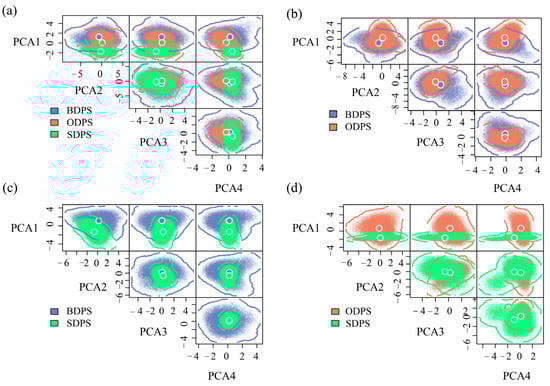 Three spotted seal populations with realized niches quantified by four-dimensional hypervolume. The larger blue, orange and green dots indicate the mean niche position (niche centroid) of the Bering population (BDPS), Okhotsk population (ODPS), and southern population (SDPS), respectively. The overlapping hypervolumes for the three populations (a), BDPS and ODPS (b), BDPS and SDPS (c) and ODPS and SDPS (d).