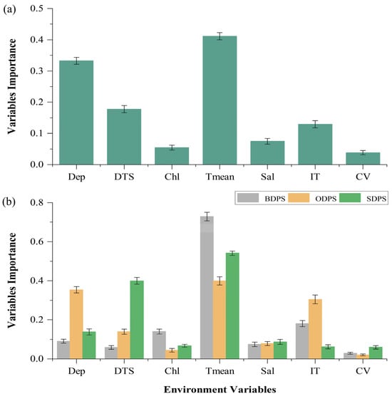 Importance of environmental variables in driving whole-species distribution based on the species-level model (a) and population distributions based on the population-level model (b). Dep, water depth; DTS, distance to shore; Tmean, water temperature; Sal, salinity; IT, ice thickness; CV, current velocity.