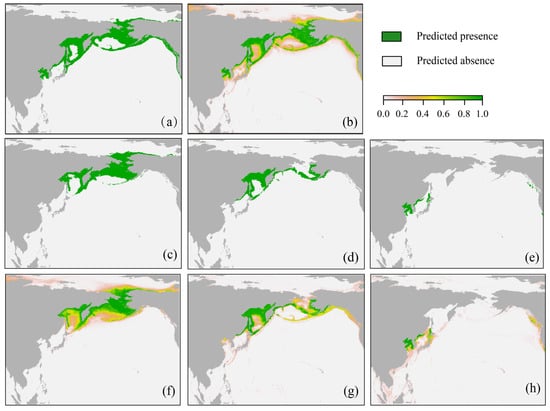 Habitat suitability map of spotted seals projected by the ensemble models under current climate scenarios. (a,b) Respective binary and continuous plots of the species; (c,f) respective binary and continuous plots for BDPS; (d,g) corresponding plots for ODPS; (e,h) corresponding plots for SDPS.