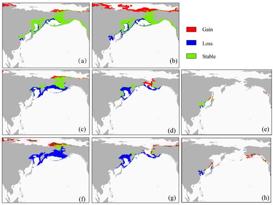 According to the results of the model, the distribution and suitable habitat of the three spotted seal populations under current environmental conditions are as follows: the BDPS is mainly distributed in the Chukchi Sea, the Bering Sea, the coast of Kamchatka Island and the northern part of the Sea of Okhotsk, with the largest area of suitable habitat (6.24 × 106 km2) (Figure 4c,f). The ODPS is mainly distributed in the Sea of Okhotsk and near Sakhalin Island, extending northward to the Aleutian Peninsula, with the second largest area of suitable habitat (3.54 × 106 km2) (Figure 4d,g). The SDPS is mainly distributed on Hokkaido Island, the Sea of Japan and the Yellow Sea of China, reaching as far as the East China Sea, with the smallest area of suitable habitat (1.08 × 106 km2) (Figure 4e,h).