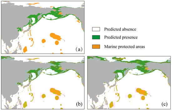 In this study, the potential range of spotted seals under future climate scenarios was overlaid with existing MPAs, and it was found that spotted seals were protected in only 6.04–6.22% of their range under the RCP 2.6 and RCP 8.5 scenarios in the 2050s and 2100s (Table 5). In summary, the overall change in the protected gap area is insignificant in the four future climate scenarios (Figure 6b,c).
