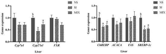 Feeding the piglets with 3% SI or 3% dietary fiber mixture decreased the mRNA expression level of carbohydrate response element binding protein (ChREBP), sterol regulatory element-binding protein-1c (SREBP-1c), and sterol 27-hydroxylase (Cyp27a1) (p < 0.05) (Figure 1).