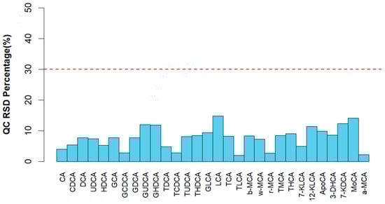 The analysis of the bile acids profile was completed by Shanghai Zhongke New Life Biotechnology Co., Ltd., Shanghai, China. Fifteen substances, including cholic acid-d4 (TRC, C432603), chenodeoxycholic acid-d4 (TRC, C291902), deoxycholic acid-d5 (TRC, D232647), glycocholic acid-d5 (TRC, G641352), α-hyodeoxycholic acid-d5 (TRC, H998102), and others, were used as isotope internal standards for quantification. The unlabeled bile acid standards, such as cholic acid (C1129), hyodeoxycholic acid (H3878), α-muricholic acid (C1890-000), taurohyodeoxycholic acid (C0890-000), ω-muricholic acid (C1889-000), and others, were obtained from Sigma-Aldrich Corporation (St Louis, MO, USA) or Steraloids Inc. (Newport, RI, USA). The bile samples were thawed at 4 °C and 100 μL aliquots were mixed with 10 μL of isotope internal standard and 500 μL of cold methanol to remove the protein. The mixture was centrifuged for 20 min (14,000× g, 4 °C), and the supernatant was dried in a vacuum centrifuge. The dried sample needed to be re-dissolved in 100 μL methanol/water (1:1, v/v) and adequately vortexed, and then centrifuged (14,000× g, 4 °C, 15 min) []. The reacquired supernatants were collected for LC-MS/MS analysis. Analysis was performed using an UHPLC (Waters Ltd., Milford, MA, USA) coupled online to 5500 QTRAP Mass Spectrometry (AB SCIEX, Foster City, CA, USA).