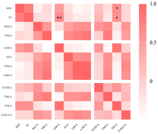 The correlation analysis indicated that there was a significant positive correlation between the serum TC concentration and the levels of GDCA (p < 0.01) and TDCA (p < 0.05) in the bile of the piglets (Figure 3).