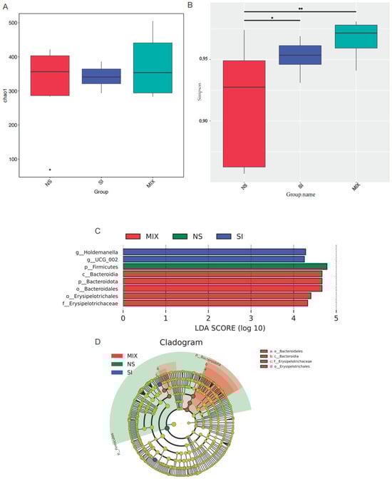 Effect of different treatment on gut microbiota in colon of piglets. (A) Chao1 index (B) Simpson’s index showing the effect of dietary fiber on species abundance and/or diversity of colon in piglets. (C) Linear discriminant analysis (LDA) effect size (LEfSe) analysis to identification of bacteria in the SI and MIX group. (D) Taxonomic cladogram obtained from LEfSe analysis of 16S sequence. *, p < 0.05; **, p < 0.01.