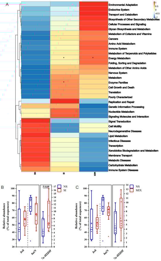 Effect of different treatment on the function of gut microbiota in piglets. (A) Heatmap of the gut microbiota function. (B,C) Functional difference analysis of colonic microbiota between the NS and SI group or the NS and MIX group. *, p < 0.05.