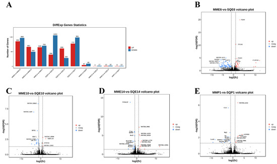 Detailed number of DEGs and volcano plots of DEGs between pigeon breeds at the same stage. (A) Detailed number of DEGs in comparison between breeds at the same stage or between stages in the same breed; (B) volcano map of DEGs from MME6-VS-SQE6; (C) volcano map of DEGs from MME10-VS-SQE10; (D) volcano map of DEGs from MME14-VS-SQE14; (E) volcano map of DEGs from MMP1-VS-SQP1.