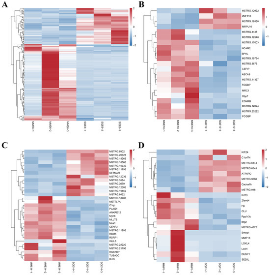 Heatmap of DEGs in comparison between pigeon breeds at the same stage. (A) heatmap of DEGs from MME6-VS-SQE6; (B) heatmap of DEGs from MME10-VS-SQE10; (C) heatmap of DEGs from MME14-VS-SQE14; (D) heatmap of DEGs from MMP1-VS-SQP1.