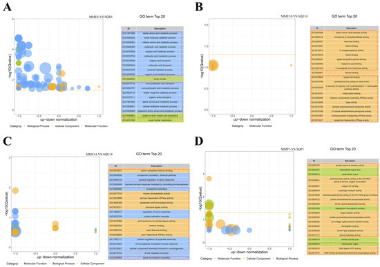 GO enrichment analysis of DEGs in comparison between pigeon breeds at the same stage. (A) Top 20 GO enrichment analysis of DEGs from MME6-VS-SQE6; (B) top 20 GO enrichment analysis of DEGs from MME10-VS-SQE10; (C) top 20 GO enrichment analysis of DEGs from MME14-VS-SQE14; (D) top 20 GO enrichment analysis of DEGs from MMP1-VS-SQP1.