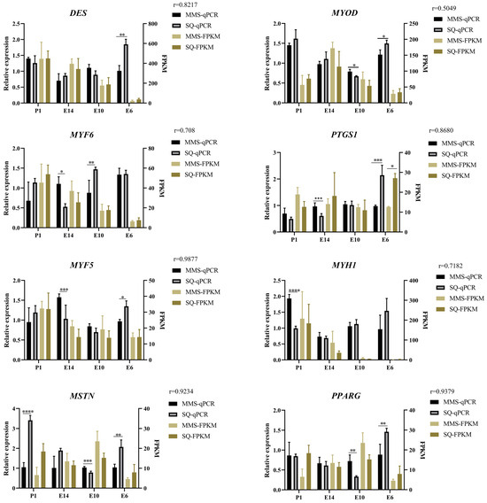Validation of myogenic DEGs using RT-qPCR. RT-qPCR of DES, MYOD, MYF6, PTGS1, MYF5, MYH1, MSTN and PPARG in SQ and MM during E6-P1. *, p < 0.05; **, p < 0.01; ***, p < 0.001; ****, p < 0.0001. The closer the absolute value of r is to 1, the stronger the linear correlation between the two variables.