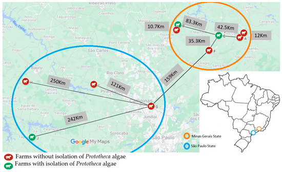 Geographical location and distance between ten dairy farms sampled in Sao Paulo and Minas Gerais states, Brazil, and isolation of Prototheca algae among cows with clinical mastitis mammary infections (2017–2022).