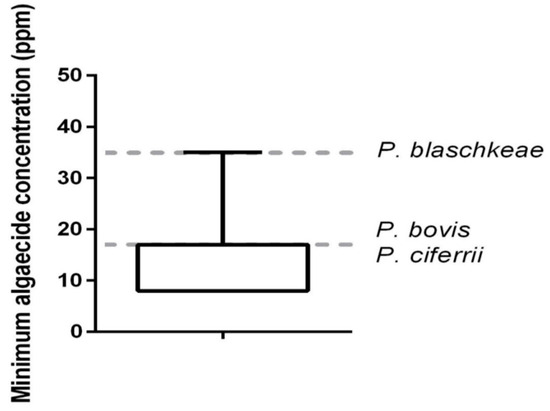 In vitro minimum algaecide concentration of quaternary ammonium on 44 Prototheca bovis isolated from clinical bovine mastitis and reference strains of Prototheca (P. bovis, P. blaschkeae, and P. ciferrii). Reference strains provided by Dr. Tomasz Jagielski, University of Warsaw, Poland [1].