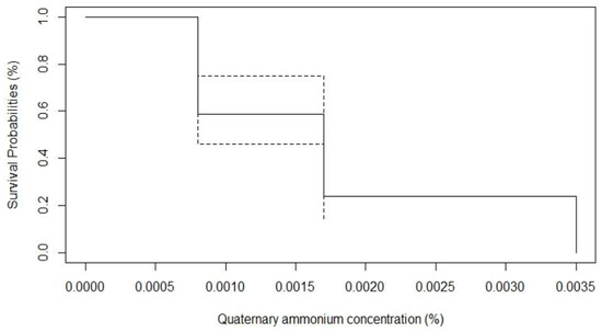 Survival probabilities of 44 P. bovis isolated from bovine clinical mastitis in face of in vitro algaecide effect of quaternary ammonium.