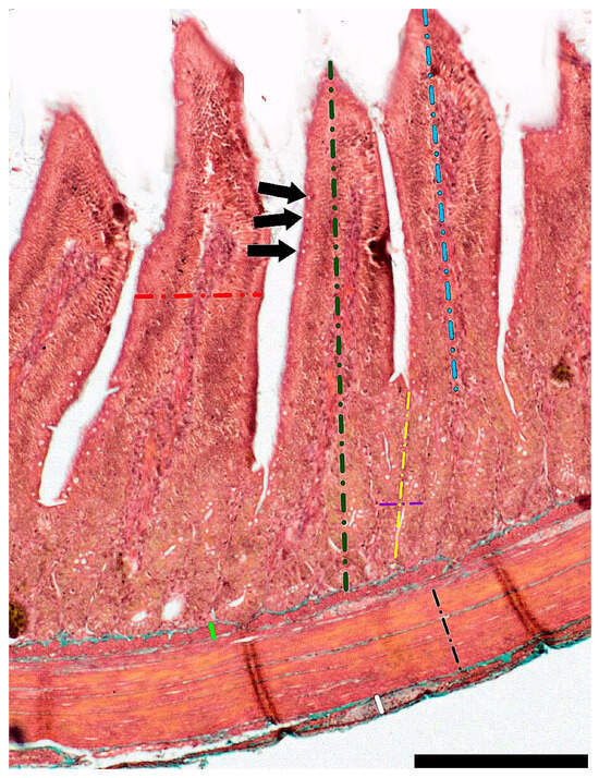 Representative image of duodenal wall showing measurement scheme of morphological traits: (blue section) villi height, (red section) villi width, (green section) mucosa thickness, (yellow section) crypt depth, (purple section) crypt width, (light green section) submucosa thickness, (black section) thickness of the inner muscle layer, (white section) thickness of the outer muscle layer, and (arrows) goblet cells. Scale bar: 200 µm.