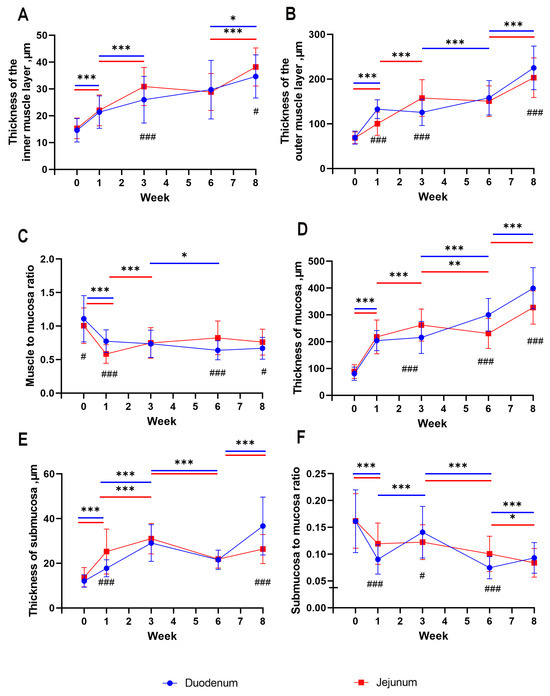 Mean values (with SD) traits of duodenum and jejunum development from hatching (week 0) to week 8 of life: thickness of the inner muscle layer (A), thickness of the outer muscle layer (B), muscle to mucosa ratio (C), thickness of mucosa (D), thickness of submucosa (E), and mucosa to submucosa ratio (F). Asterisks above colored lines indicate significant differences between measurements at the next time points (* p < 0.05; ** p < 0.01; *** p < 0.001). Number signs indicate significant differences at a given time point between duodenum and jejunum (# p < 0.05; ### p < 0.001).