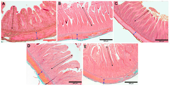 Representative photomicrographs of Goldner’s staining of duodenum with examples of changes in the traits of intestine structures during goose development during (A) week 0, (B) week 1, (C) week 3, (D) week 6, and (E) week 8. Black sections indicate changes in villi height, and blue sections indicate changes in thickness of inner muscle layer. Scale bars: red, 200 µm; black, 500 µm.