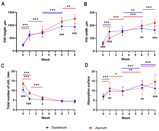 Mean values (with SD) traits of duodenum and jejunum development from hatching (week 0) to week 8 of life: villi height (A), villi width (B), total number of villi per 1 mm (C), and absorption surface (D). Asterisks above colored lines indicate significant differences between measurements at next time points (* p < 0.05; ** p < 0.01; *** p < 0.001). Number signs indicate significant differences at given time point between duodenum and jejunum (# p < 0.05; ## p < 0.01; ### p < 0.001).