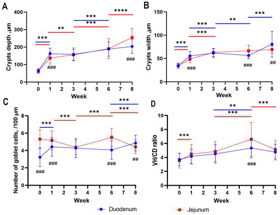 Mean values (with SD) traits of duodenum and jejunum development from hatching (week 0) to week 8 of life: crypt depth (A), crypt width (B), number of goblet cells per 100 µm (C), and villus-height-to-crypt depth ratio (VH/CD ratio) (D). Asterisks above colored lines indicate significant differences between measurements at next time points (** p < 0.01; *** p < 0.001). Number signs indicate significant differences at given time point between duodenum and jejunum (## p < 0.01; ### p < 0.001).