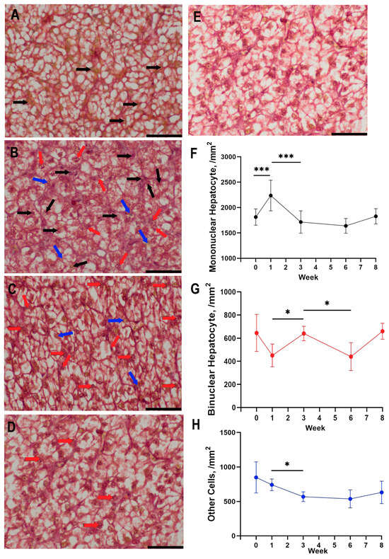 Morphological changes in the liver during development in geese from hatching (A), week 1 (B), week 3 (C), and week 6 (D) to week 8 (E) of life and changes in cell numbers, represented by mean values (SD), of mononuclear hepatocytes (F), binuclear hepatocytes (G), and other cells (H). Asterisks above lines indicate significant differences between measurements at next time points (* p < 0.05; *** p < 0.001). Arrows indicate significant changes in number of mononuclear hepatocytes (black), binuclear hepatocytes (red), and other cells (blue). Scale bar: 40 µm.