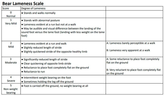 An interobserver rating score between 0.75 and 0.9 indicates good reliability, and scores greater than 0.9 indicate excellent reliability [46]. Thus, using video recordings where the bear can be seen from the front and side and the limbs can be visualized, the BLS can reliably be used between observers of different backgrounds to identify and monitor lameness.